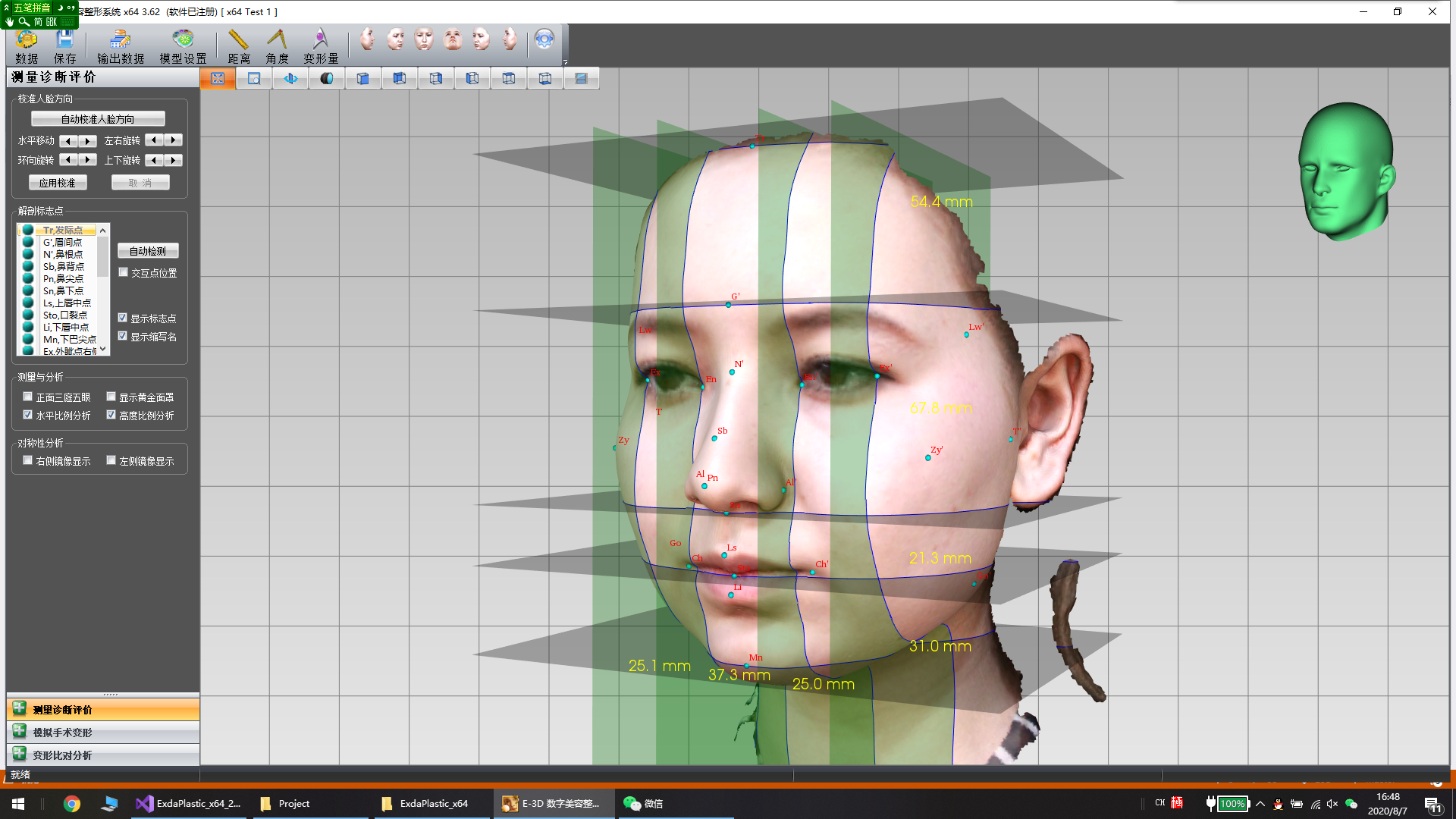 三維解剖標(biāo)志自動檢測。模型方向校準(zhǔn)、解剖標(biāo)志設(shè)置簡單,包括自動檢測和交互選點(diǎn);智能美學(xué)分析。自動生成三庭五眼、黃金比例面罩、水平比例分析、高度比例分析、對稱性分析;