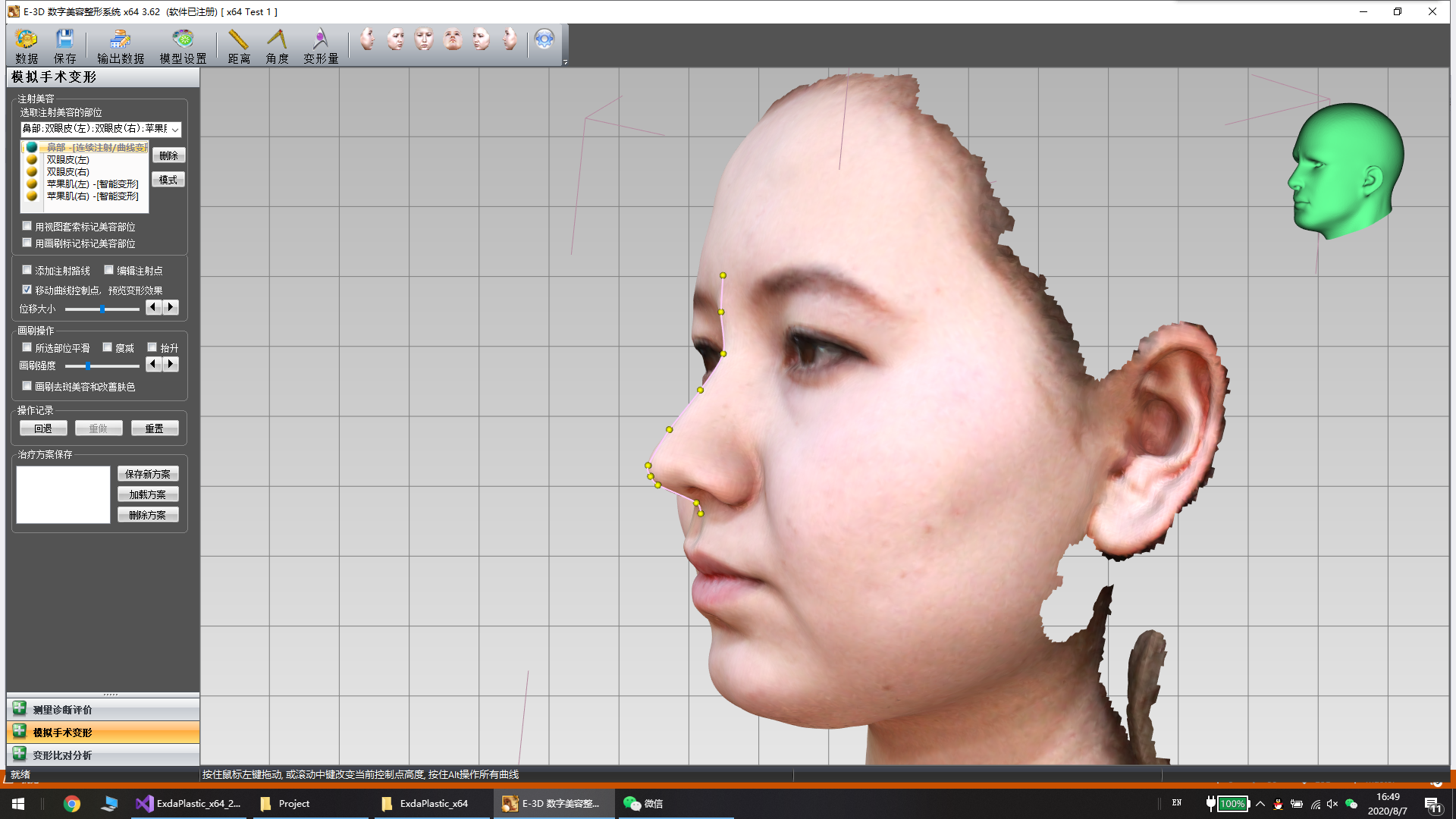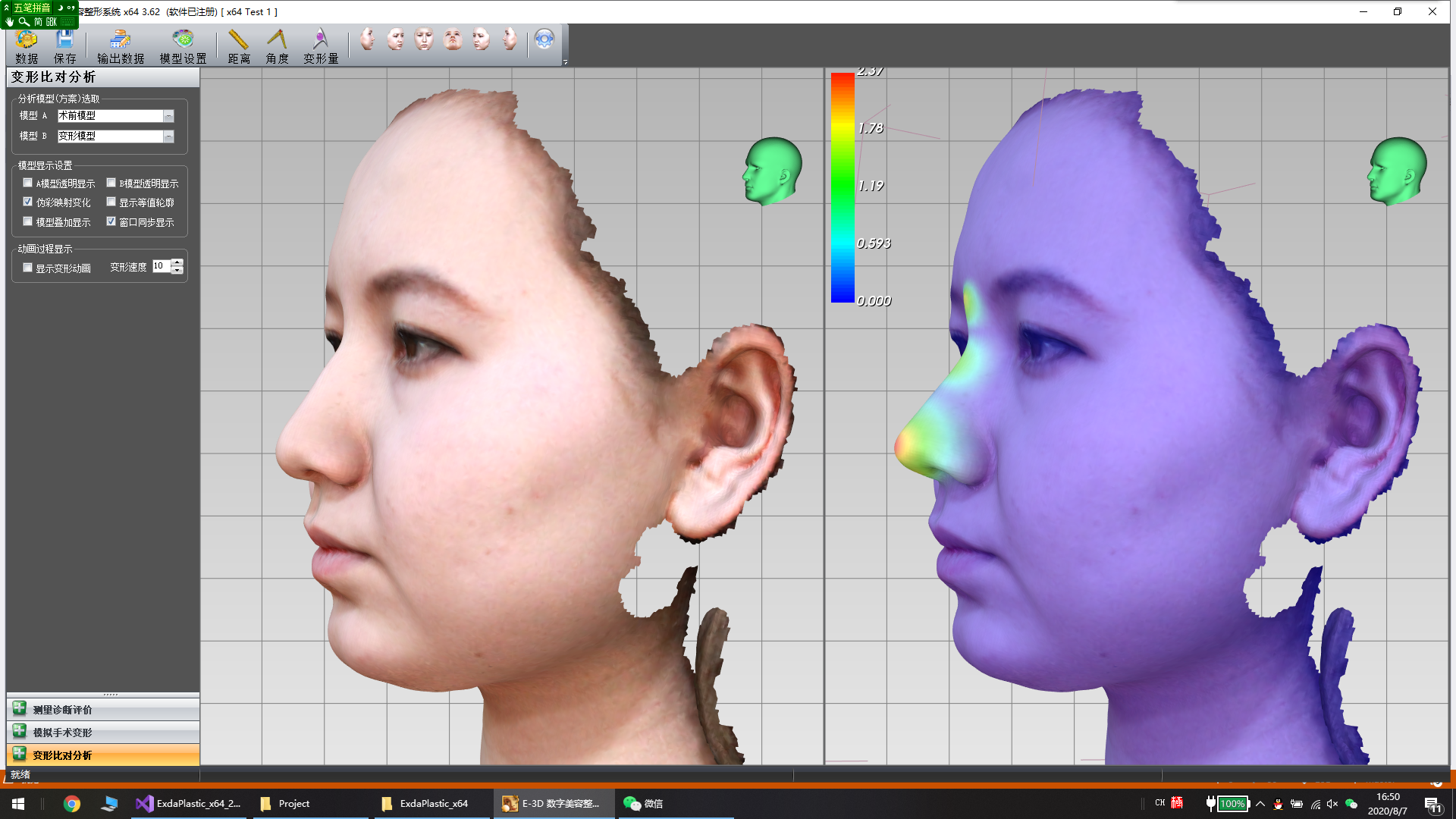 手術(shù)設(shè)計智能變形。提供多種功能進(jìn)行變形比對分析,包括去斑美容整形等美容整形仿真工具,偽彩映射變形信息、等值線輪廓、透明模型疊加顯示、變形過程動畫等。
