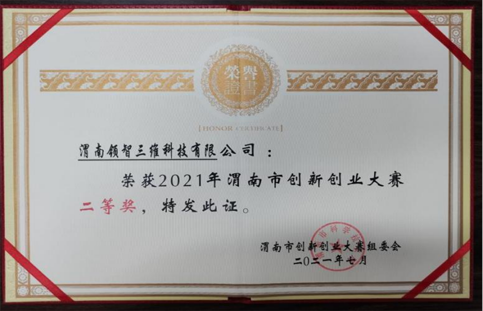 領(lǐng)智三維榮獲2021年渭南市創(chuàng)新創(chuàng)業(yè)大賽高端裝備制造組二等獎