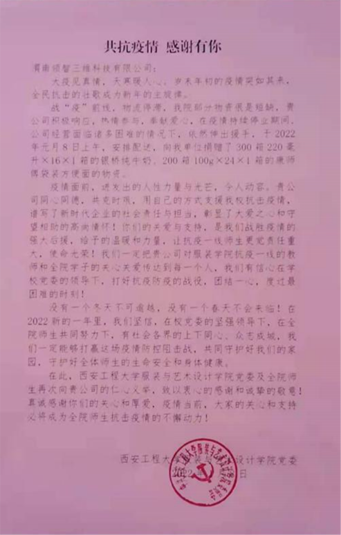 物資抵達(dá)工程大學(xué),西安工程大學(xué)副校長(zhǎng)殷永建、服裝與藝術(shù)設(shè)計(jì)學(xué)院黨委書(shū)記李筱勝、服裝與藝術(shù)設(shè)計(jì)學(xué)校黨委副書(shū)記張?bào)K帶領(lǐng)學(xué)院抗疫小組成員接收了捐贈(zèng)物資,并及時(shí)的組織分發(fā)給在校隔離的學(xué)院學(xué)生。校院兩級(jí)黨委對(duì)渭南領(lǐng)智三維科技有限公司在封閉管理期間的慷慨解難表示感謝,對(duì)校友在危難面前勇于擔(dān)當(dāng)、鼎力相助的善舉表示贊揚(yáng)。