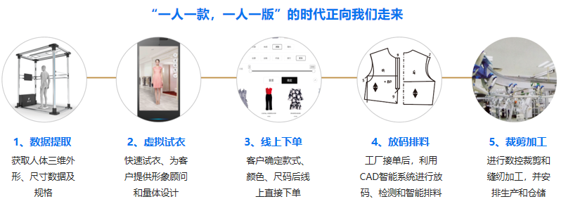 通過三維掃描輸出通用格式的量體數(shù)據(jù)和3D人體模型,設計出更符合人體的服裝板型,優(yōu)化企業(yè)的服裝尺碼表和板房人臺??芍苯虞斎氲椒b制板系統(tǒng)中,快速生成一人一版的紙樣進行生產(chǎn)。也可以與3D虛擬試衣軟件對接,在門店展示3D試衣效果。