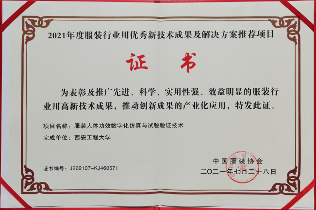 基于共建雙方的科研團(tuán)隊(duì)及研究基礎(chǔ),“服裝人體功效數(shù)字化仿真與試驗(yàn)驗(yàn)證技術(shù)”獲得由中國服裝協(xié)會頒發(fā)的“2021年度服裝行業(yè)用優(yōu)秀新技術(shù)成果及解決方案推薦項(xiàng)目”,主要涉及的關(guān)鍵技術(shù)包括服裝防電磁輻射、防刺防砍裝備性能動力學(xué)仿真分析、服裝與人體動態(tài)接觸壓力仿真分析等,推動數(shù)字化服裝定制設(shè)計(jì)的研究成果及產(chǎn)品在服裝行業(yè)的應(yīng)用。