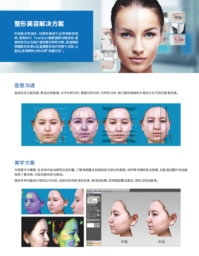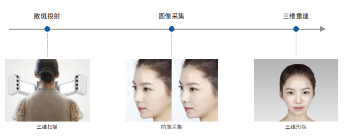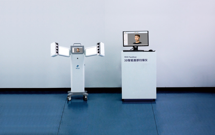 領(lǐng)智三維自主研發(fā)的RDS FaceScan 3D智能面部掃描系統(tǒng),通過(guò)向人體表面投射散斑圖案,并對(duì)多組光學(xué)三維測(cè)量組件進(jìn)行聯(lián)動(dòng)控制,迅速完成所有相機(jī)的圖像采集。借助采集到的彩色圖像、多相機(jī)高精度標(biāo)定參數(shù),以及擁有完全自主知識(shí)產(chǎn)權(quán)的軟件匹配重建算法,該系統(tǒng)能夠快速重建出面部三維彩色模型。