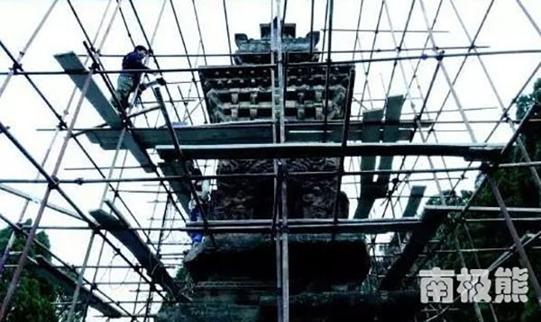 3D打印助力濟(jì)南四門塔千年文物大修,圖為龍虎塔搭起了腳手架