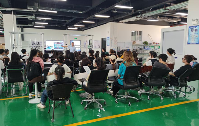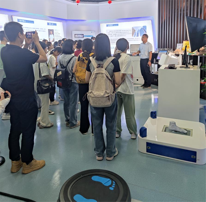 學(xué)生們參觀了公司展廳、研發(fā)中心及生產(chǎn)調(diào)試車間,領(lǐng)智三維運營總監(jiān)丁軍濤為大家做參觀講解。他從公司的發(fā)展歷史、核心技術(shù)、產(chǎn)品方案以及產(chǎn)業(yè)應(yīng)用等方面,向?qū)W生們詳細(xì)地呈現(xiàn)出一個具有自主核心技術(shù)、富有活力的新興朝陽企業(yè)。作為一個專注于人體三維數(shù)字化技術(shù)研究的高科技公司,領(lǐng)智三維自主研發(fā)的人體全身三維掃描、面部三維掃描、腳型三維掃描產(chǎn)品等,這一系列新奇的技術(shù)與人體測量體驗,激起了學(xué)生們探索其背后之技術(shù)奧秘的興趣。