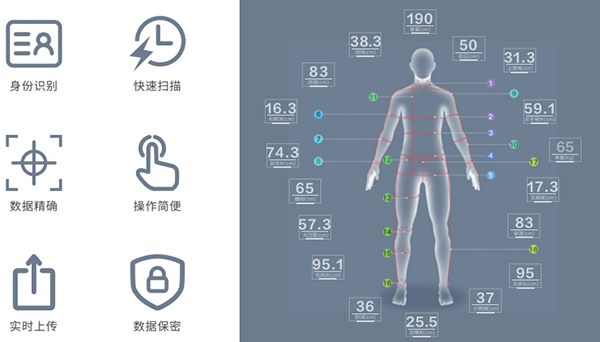 領(lǐng)智三維BodyScan系列三維人體掃描系統(tǒng),采用自主知識(shí)產(chǎn)權(quán)的3D紅外傳感測(cè)量技術(shù),通過(guò)多組3D深度攝像頭的同步控制,可高效、準(zhǔn)確地采取人體三維數(shù)據(jù),完成幾十項(xiàng)人體關(guān)鍵尺寸提取并集成了人體身體成分的相關(guān)算法,在人體測(cè)量的同時(shí)可同步輸出人體相關(guān)的體型體態(tài)信息。